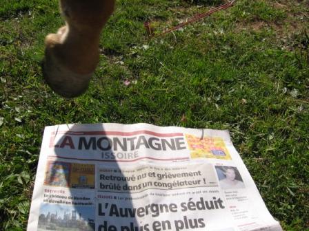 ‘Massif Central’. The local paper was even From La Celle Dunoise we followed a beautiful riverbank path through the woods. The path was ‘balisé’ which meant there were splashes of paint all over the trees to mark the way. They just love throwing the paint around. Almost every village has a yellow route, a blue route, a green route. The long distance footpaths (Grandes Randonées, GRs) are always marked with red and white paint. We’d followed lots of bits of GRs and they were an easy way of keeping off the roads as much as possible. Unfortunately, however, there’s no guarantee that these walking routes are possible on a horse.