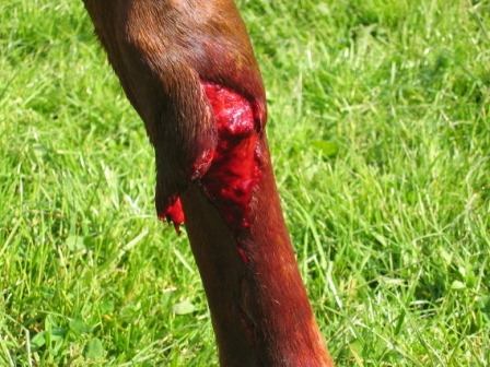 we stopped in a narrow side So in I went, slipped the head collar on, and quietly suggested to Sealeah that we both get the hell out of there. But she had other ideas. As the bull threw his horns around and pawed the ground bringing up clouds of dust, Sealeah took a few steps but then decided that it would be a good time to answer a call of nature…and just stopped in her tracks. I can’t tell you how long those few seconds lasted, but believe me it was a long time. Eventually she finished and allowed me to lead her away. We spent half an hour repairing the electric fence but Sealeah’s leg was going to take a lot longer – the galloping about had undone all the healing and we were back to square one.