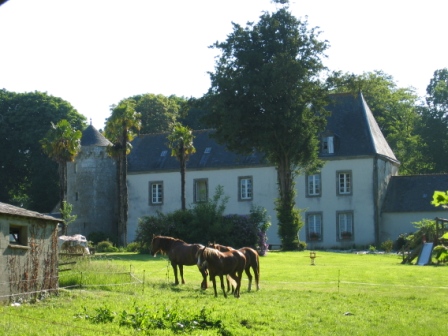 22nd May to 31st May, Camping à la ferme, Croas Men, Finistère, Brittany The first thing we did when we arrived in France was discover that the French don’t have fields, not proper ones anyway with hedges or fences. Instead they have bits of open land with, if you’re lucky, an electric wire running round them. When we asked why they didn’t have proper fields, the answer was something along the lines of “because we’ve discovered electricity”. Still, if you can’t beat ‘em, join ‘em. After a couple of belts on the nose from the mains, the horses are now highly respectful of any bit of wire, tape, even baling twine. The second thing we did was have a horrible accident with Sealeah. We’d given the horses a couple of days off after the ferry and had decided to ride to the beach. A mere quarter of a mile from the campsite, the track took a small stone bridge over a stream. Somehow we’d missed a narrow path through the trees that led to a ford. The bridge was only a couple of feet above the stream bed level and both Hannah and Audin strolled over it without batting an eyelid. Lisa paused for a second on the other side and this left Sealeah and me stuck on the bridge. Sealeah panicked and slipped off into the water, cutting her knee open in the process and collecting a whole array of other cuts all over her legs. It was messy, very messy, blood everywhere, Sealeah freaking out. We led them straight back to the farm, out came the veterinary kit and Lisa set to work stitching her up. It was going to need a week to heal. We were gutted, and angry with ourselves. It was an accident, but it had been avoidable. Why hadn’t we taken the time to look for a route through the stream? As part of our punishment, the one and only village shop had closed for ten days and the next nearest shop was a ten mile round trip…and there was no bus. At least this kept us fit. The waiting was frustrating, a whole week in one place! After moving on all the time it seemed like forever. We used the time to look around a bit, learn some French and chat with the Bretons. House, stone, dog and mare are ty, maen, ci and caseg in Welsh and, we learned, ty, men, ki and keseg in Breton. These people might as well just admit that they’re Welsh.
