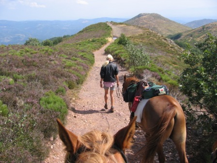 Mézenc. There must have been some kind of Birds of Prey At the gite d’étape beneath Mont Gerbier de Jonc we were told that they were full, and no, we weren’t allowed to pitch the tent, camping was ‘absolutely banned’. Two hundred yards away we found a great camping spot, out of sight, lots of grass and right at the source of the Loire. I can guarantee that nobody’s cup of Loire water tea was fresher than ours that evening. On our first full day in Ardèche it rained solidly all day. By mid-morning we were soaked to the skin and after that we just got wetter and softer and more crinkly. To add to this fun, we were caught out in a thunderstorm on a high ridge. As the thunder got closer and louder, we rounded a corner and saw that the path passed beneath a radio mast. Just as we passed the mast it was struck by lightning and all five of us bolted at once with the shock. Lisa was knocked to the ground by one of Hannah’s panniers (she doesn’t like to bang them on gate posts or trees but has discovered that people just bend and give way…) and we were all a bit shaken. A second strike hit the ground right in front of me with a blinding flash of light. We scurried down off the ridge as fast as our sixteen legs could carry us. That night we were lucky to find a campsite at Intres where the owners, Jean-Pierre and Michelle, let us put the horses in a round pen with a couple of bales of hay. We were invited in for dinner, all delicious and all home grown. After the day we’d had it was more than welcome and we couldn’t thank them enough.