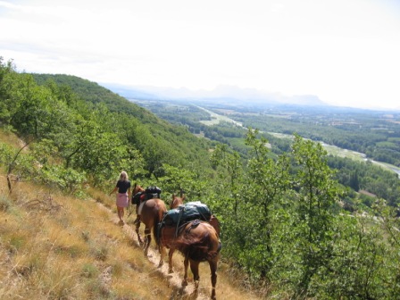 The kindness was repeated again the following day. Late afternoon, nowhere to stay, nowhere practical for a bivvy, a man came out of his farmhouse. We started talking and an hour later we were having dinner with his family while the horses grazed contentedly in his field. We liked Ardèche and not just because of the hospitality; the landscape was beautiful too. I talked with a woman who was trying unsuccessfully to drive her goats down to better grazing. I told her she was lucky to live in a beautiful place. She told me it was ‘poor’ and that they didn’t have enough rain. We carried on along ancient tracks winding through woods of chestnut and oak and emerged on a long high ridge descending towards the Rhone Valley with fantastic views across to the Vercors.