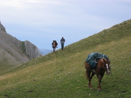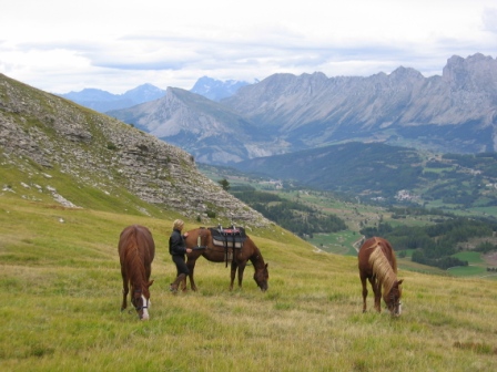 rounded a bend to find “Le Jardin de The following day we were blessed with a perfect clear blue sky. Marmots screamed and ran to their burrows as we weaved our way up to the Col de Freissinieres at 2782m. The descent was very steep at first, the horses placing their feet carefully on the narrow path across the scree. But it soon levelled off into a stunning alpine meadow of sweet mountain grass, criss-crossed with sparkling clear streams. As a lunch stop, it was unbeatable. If April, May, June, July and August had been an excuse for picnics, why not September as well? The next few days were another succession of cols and valleys (Fressinieres, Fournel, Gironde) as we followed the GR50-tour du Haut Dauphine – to Briancon. We knew this area from winter ice climbing trips and it was great to be back. Each night was a bivouac in a high alpine meadow with the horses enjoying both the lush grazing and the views. One morning, up above the Fournel Valley, we watched the first rays of the morning sun hit the high summit of Mont Pelvoux and the Pic Sans Nom. These were special days: sunshine at the end of a long summer, autumn crocuses along the tracks, trees dripping with fruits and berries, wave after wave of peaks in every direction.
