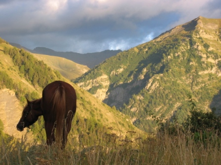 Our escape from La Jarjutte was via a stiff 900m climb up to the Col des Aiguilles at 2003m. The push to the col was only interrupted by Hannah spotting a herd of Bouquetin scrambling across a scree slope and insisting that we all stop and stare for a while. The col marked the border with Hautes Alpes, our final departement in France, and the Devoluy area. Later that afternoon we followed a path which contoured across a steep wooded slope down to the village of St Etiene en Devoluy. In a few places, the path crossed bare limestone slabs and skidding hooves gave us a few scary moments – the kind of track that is just about passable with a horse but you wouldn’t want to do again. We camped that night on a patch of communal land in the village. On the edge we found a stinking wolf skin tied to a blood-soaked length of baling twine: a grisly reminder that the re-introduction of wolves to that region has not been without its opponents.